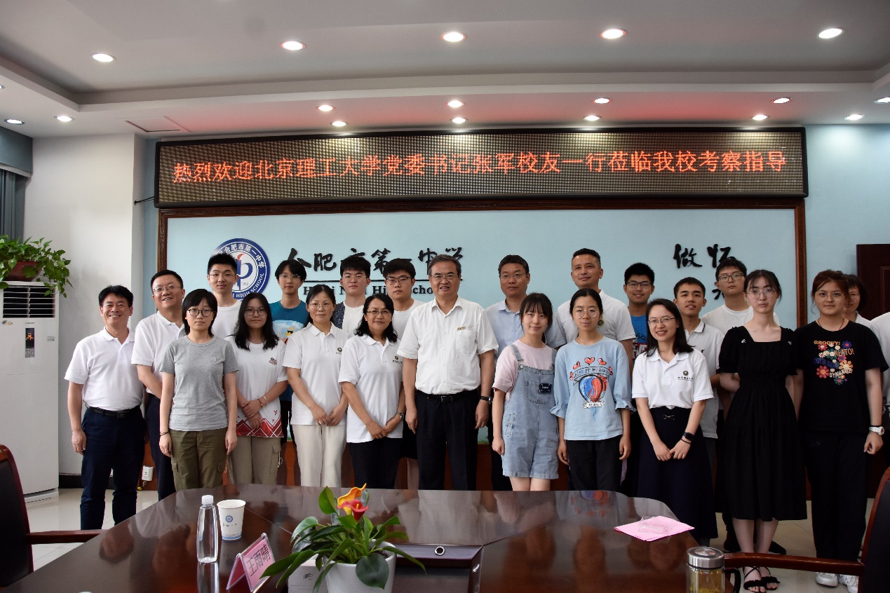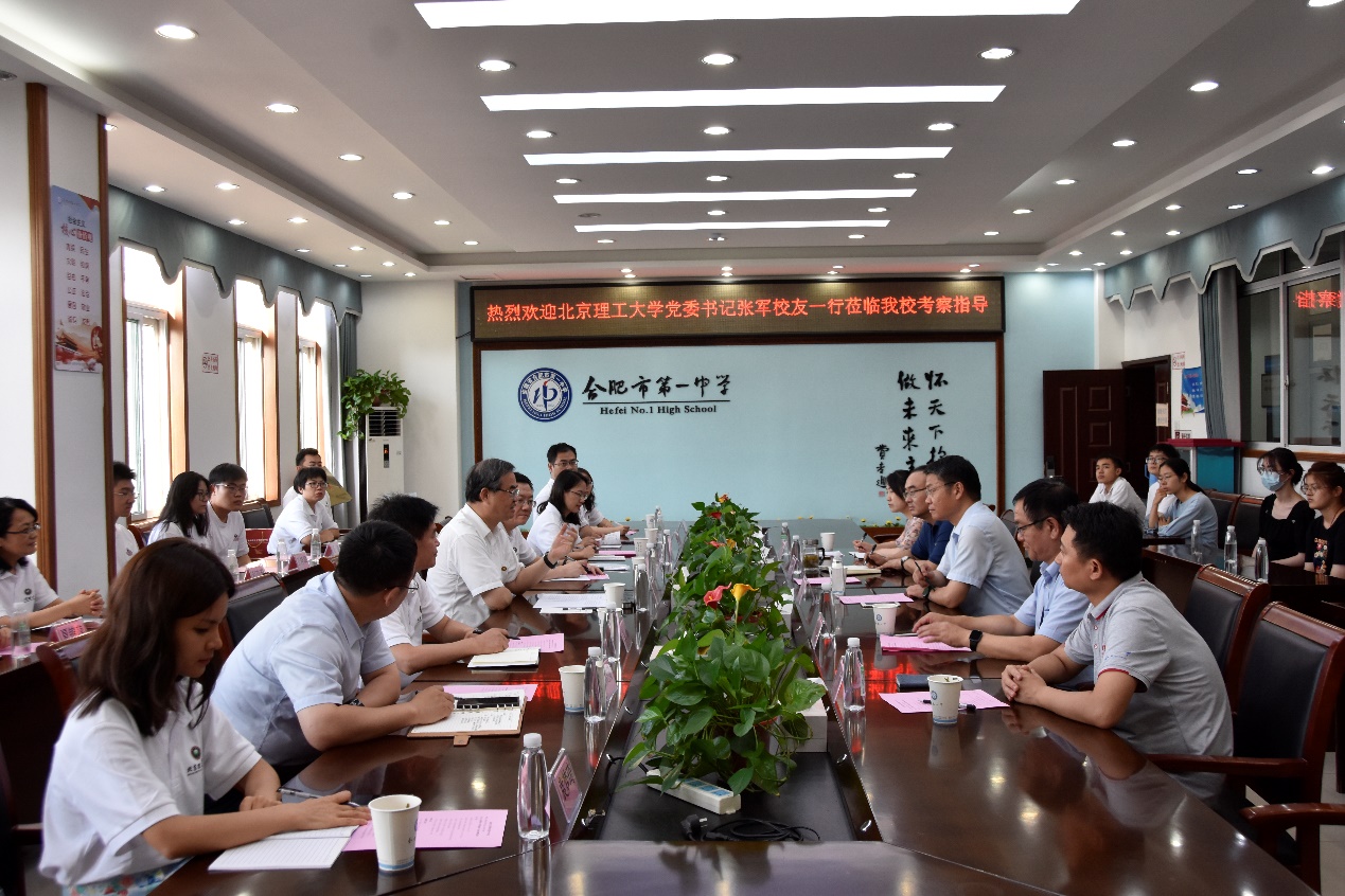 在合肥市第一中学,张军一行参观了合肥一中校史馆并开展调研交流。合肥一中校长封安保,副校长张大勇胡晨、尤光雷,北理工——合肥一中家委会思源学子和2023报考生代表参加座谈