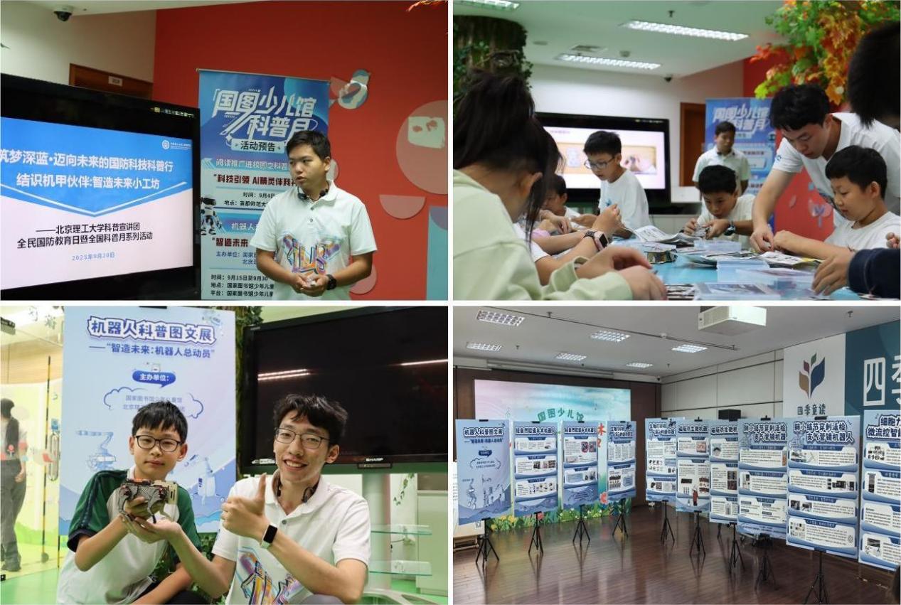 2025年9月20日上午,科普宣讲团结合九三阅兵出现的智能无人系统装备,在国家图书馆面向青少年们开展“结识机甲伙伴:智造未来小工坊”机器人专题科普讲述,并指导参加的中小学生动手体验机器人设计制作,提升青少年们科学素养。此前,由太阳集团城娱8722兵器智能系教师代表提供的“制造未来:机器人总动员”图文展正在国家图书馆展出。