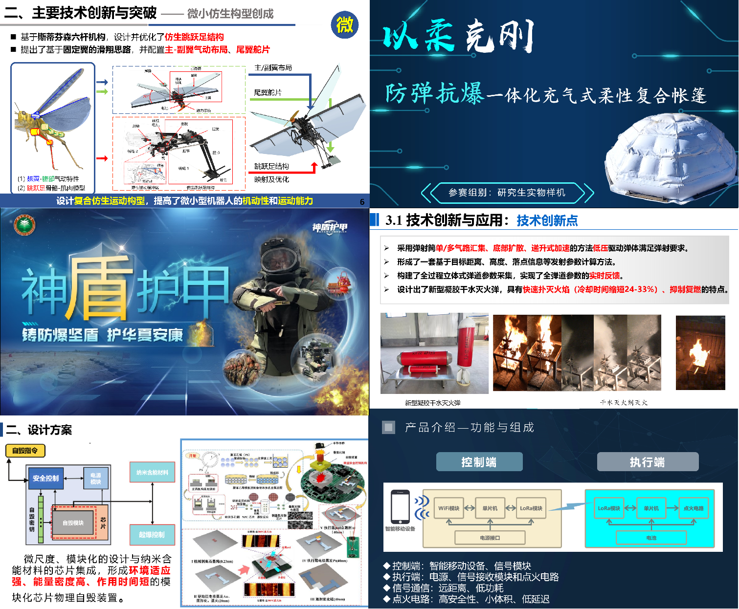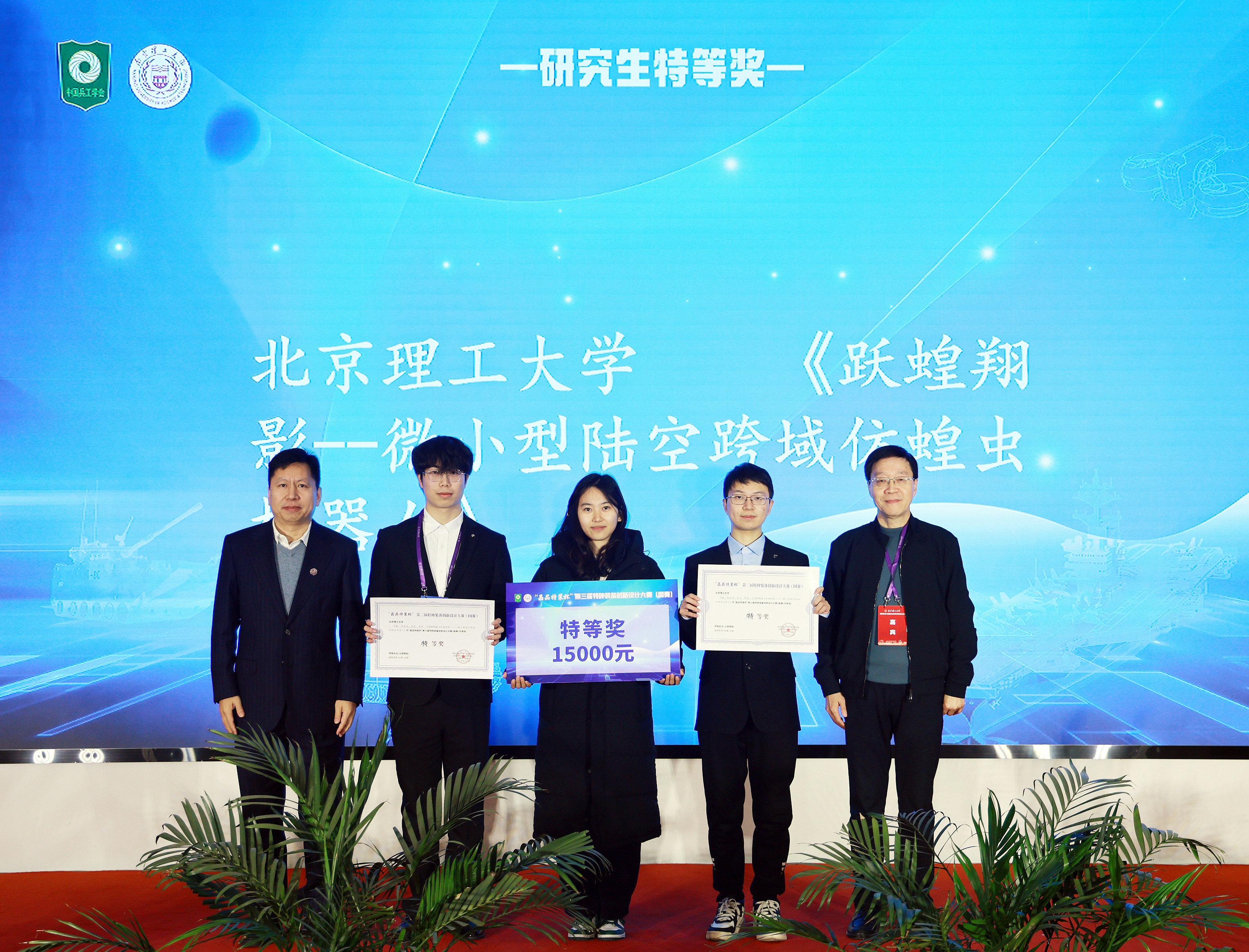 在经过激烈角逐后,我院“跃蝗翔影——微小型陆空跨域仿蝗虫机器人”脱颖而出,取得研究生组唯一特等奖。该项目借鉴参考蝗虫的生物特性,研究爬行-跳跃-滑翔多模态机构的耦合设计方法与多模态协同控制方法,实现了微小型机器人复杂环境上高效率、高爆发的运动。爬行可实现稳定移动与姿态调整,跳跃具备瞬时的爆发能力,滑翔则可以扩展探测视野以及越过大型障碍,将三者相结合能实现稳定、高效的复杂环境运动。本机器人具有小巧的体积和高效率的运动模式,可用于监测需要机器人长期待命的复杂环境;且机器人隐蔽性好、运动效率高、待机时间长更能适应战场环境。